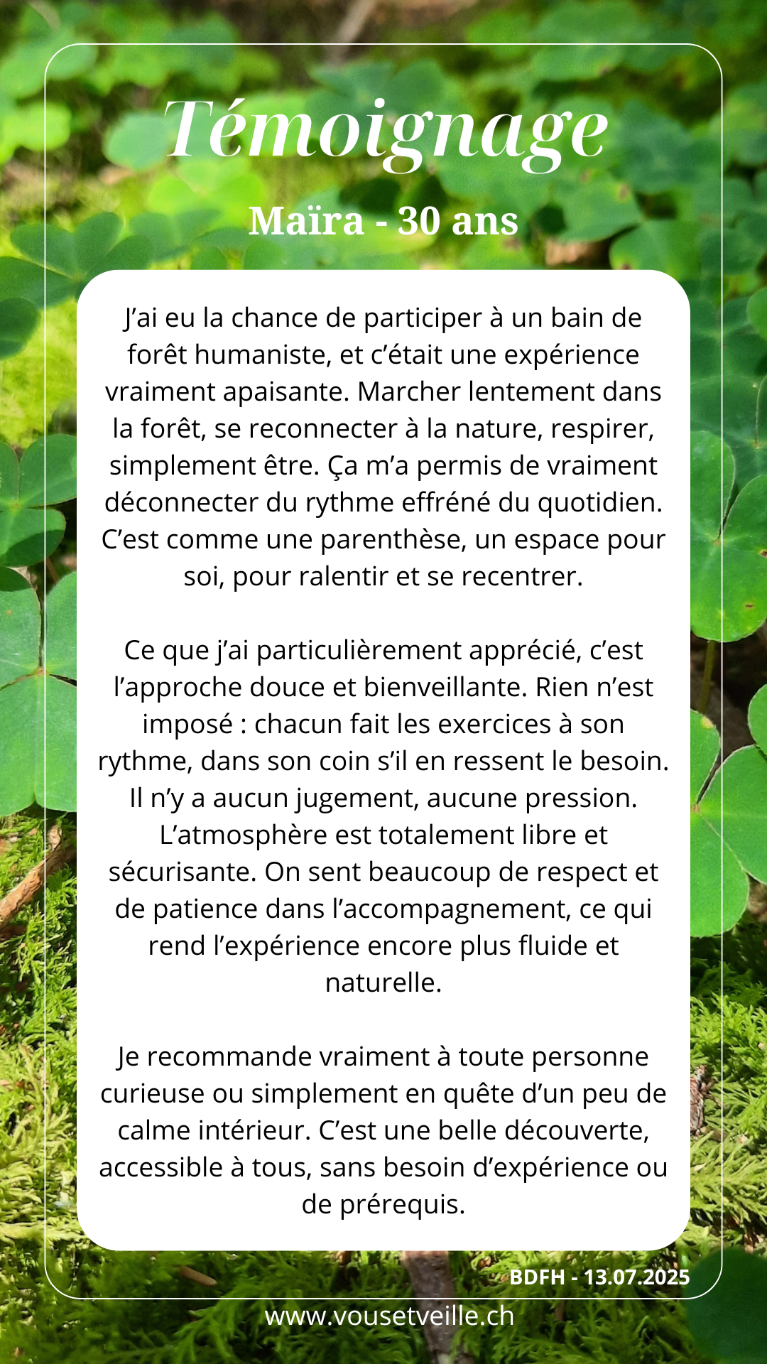 - Les bains de forêt humanistes : pratique japonaise nommée shinrin yoku*, une immersion consciente et sensorielle avec la nature pour apaiser le mental et reconnecter vous relier au vivant.