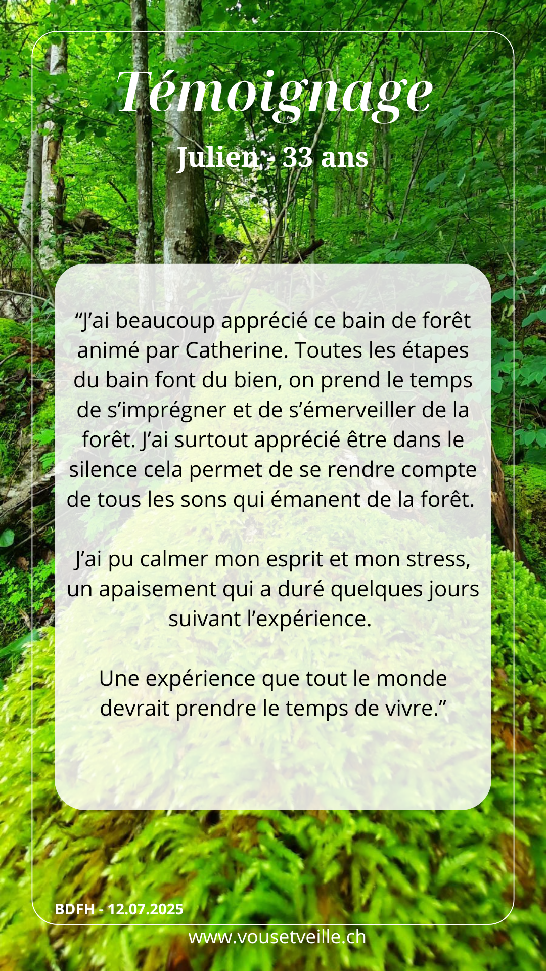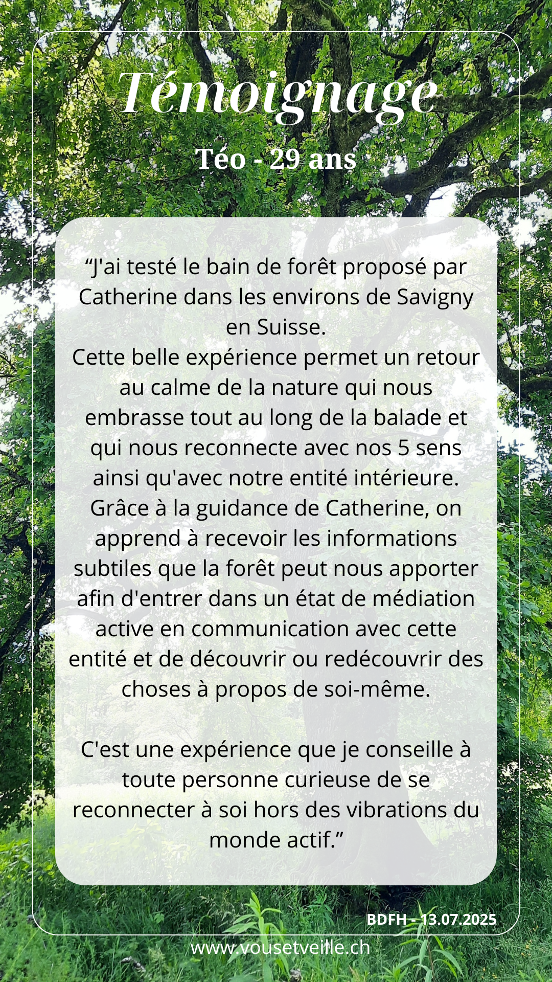 En quoi c’est important : cet accompagnement guidé invite à ralentir, à prendre conscience de soi dans l’espace plus vaste du vivant, à développer l’ouverture à soi, aux autres et à la nature. Cette immersion consciente en forêt, permet d’utiliser tous les sens et de renouer avec votre nature profonde pour cultiver une pleine présence.